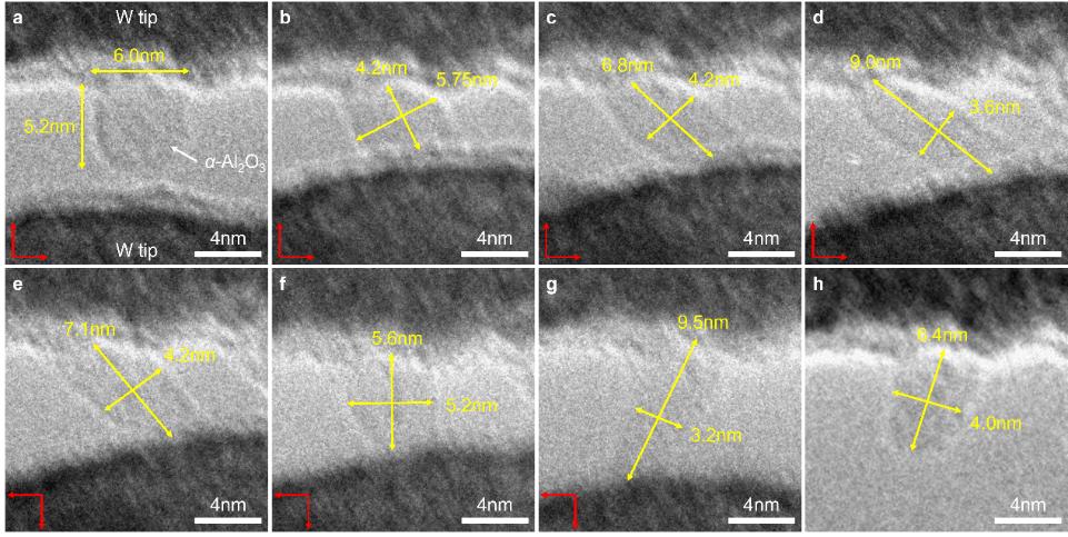 图3.刚玉纳米颗粒的室温赝弹性变形行为。加载前的初始状态(a)、加载(b-d)和卸载(e-g)期间颗粒的动态形状演变及卸载后的颗粒状态(h)。左下角的红色箭头表示底部W尖端相对于顶部W尖端的移动方向。为了更好理解刚玉纳米颗粒粗化背后的潜在物理机制,作者进一步对刚玉纳米颗粒的高温粗化动力学过程进行了研究,结果显示,刚玉纳米颗粒不仅具有极低的粗化激活能(~0.25 eV),而且伴随着明显的粗化停滞现象(图4所示)。基于此,作者推测,一些非经典的物理机制,如团簇在颗粒表面的运动、溶液(吸附水)增强的表面扩散、表面和/或颗粒内部的结构驰豫,或许也在刚玉纳米颗粒的室温粗化过程中发挥了很重要作用。