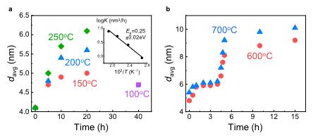 图4.刚玉纳米颗粒的高温粗化动力学过程。a中的插图为计算得到的动力学参数K的阿伦尼乌斯曲线。该论文发现的刚玉纳米颗粒室温粗化现象和赝弹性变形行为,一方面表明了活跃的表面扩散在远低于熔点的室温下就可能会发生,另一方面也对陶瓷纳米颗粒体系的稳定性带来了新的见解,这也有望拓展“惰性”陶瓷纳米颗粒新的应用领域。