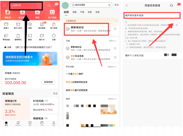 3、银行卡更换证件路径:前往附近银行,或前往银行APP联系客服,等待客服回复身份证更新方式。(以招商银行APP身份证信息更新方式为例)