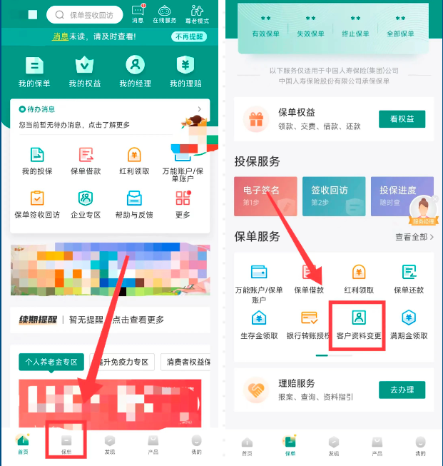 5、保险软件更新途径:打开APP-保单-客户资料变更。(以中国人寿保险APP更新路径为例)