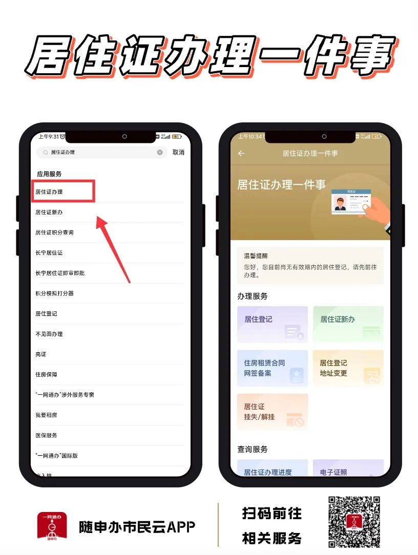 “随申办市民云”APP【居住证办理一件事】,可进行居住证新办、居住证登记地址变更