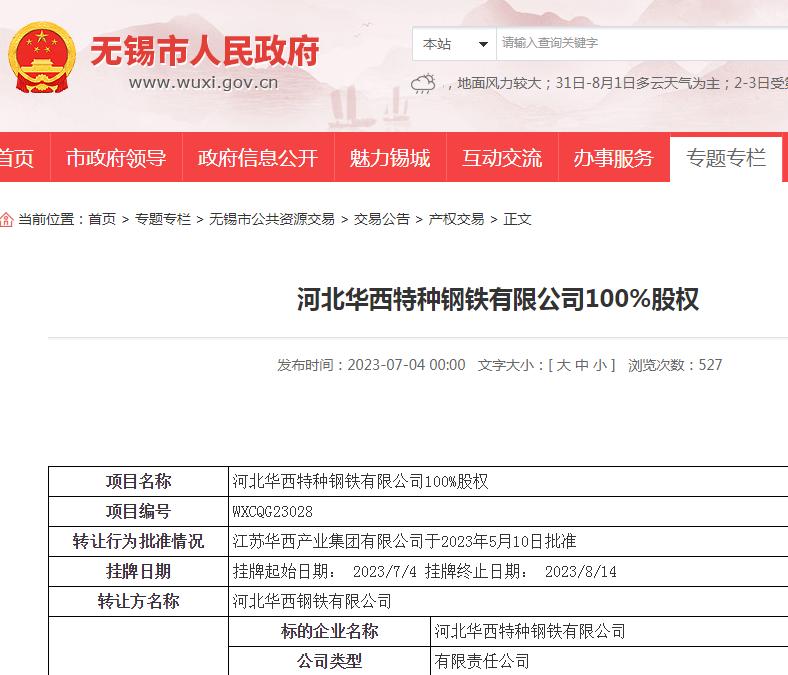 2023年7月4日,无锡市人民政府发布信息——河北华西特种钢铁有限公司100%股权拟转让,转让底价为30亿元。