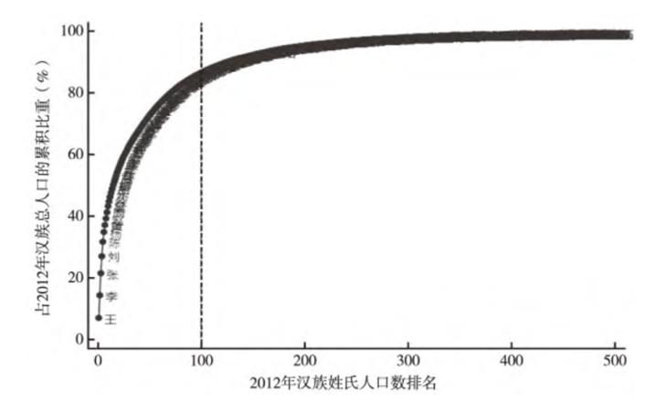 随着几千年的历史发展, 中国的姓氏数量与姓氏人口也不断增加。2012年前100名的姓氏人口占汉族总人口的87.0%(见图1) 。而法国前100名常见姓氏仅占总人口的8.1%, 美国前100名常见姓氏仅占总人口的16%。