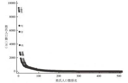 从图2可见,少数几个姓氏(比如王、李、张、刘、陈) 的人口特别多,故姓氏人口的集中度很高。