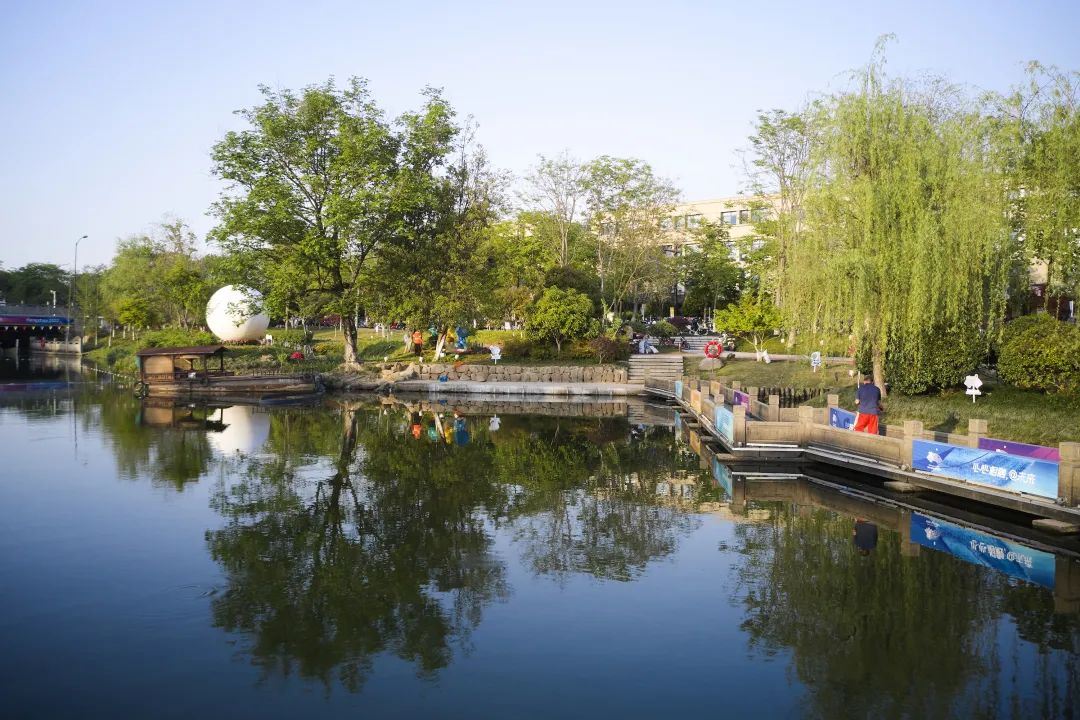蒋村港亚运小公园依托“省级美丽河湖”优势,以水为带,将丰富的自然景观和历史民俗结合起来,通过拆除违章、清理菜地,全面整治提升、变废为宝,融合亚运元素,设置亚运倒计时、亚运吉祥物、主题花境、历史文化墙绘等小品,以及一颗直径4米的“月球”。夜晚亮灯时分,岛上月、水中月与天上月遥遥相对,美不胜收,曾经的荒地成为打卡地。