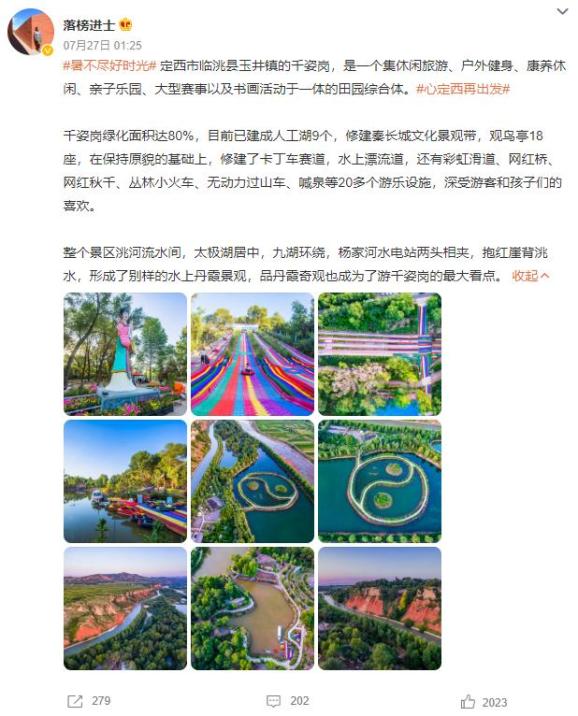 定西市临洮县玉井镇的千姿岗,是一个集休闲旅游、户外健身、康养休闲、亲子乐园、大型赛事以及书画活动于一体的田园综合体。