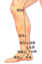 [定位]在小腿内侧,太溪直上2寸,跟睫的前方。