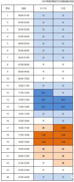 在现行电价标准(每千瓦时0.555元,含税)基础上,深谷时段每千瓦时降低0.333元,低谷时段降低0.17元,高峰时段提高0.03元,尖峰时段提高0.333元。即深谷时段电价为每千瓦时0.222元、低谷时段为0.385元、平时段为0.555元、高峰时段为0.585元、尖峰时段为0.888元。居民电动汽车充电桩分时电价政策由居民用户自愿选择,电网企业免费更换分时电能表,调整后的电价政策自申请次月起执行,以年度为周期,1年内不作调整。不选择的,仍按原方式计价。向电网经营企业直接报装接电的经营性集中式充换电设施用电价格政策,继续根据国家现行有关规定执行。完善后的分时电价政策自2023年9月1日起执行。