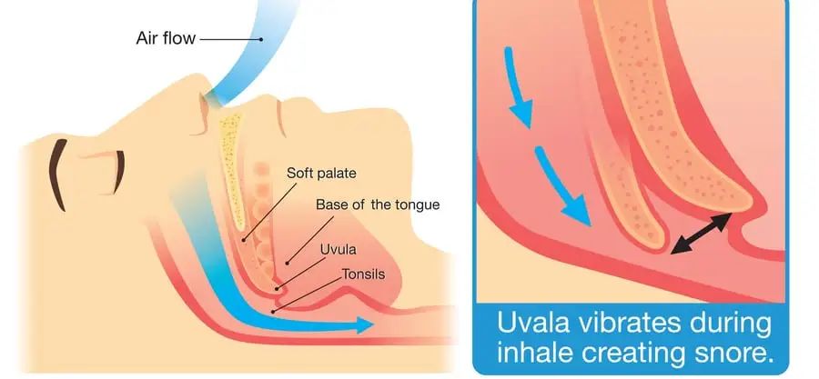 ▲图片来源:Google通过图片我们可以看到,正常睡眠时的呼吸是通畅的,而当人体呼吸道周围的肌肉变得松弛,或者是生理结构异常,就会导致呼吸道变窄甚至塌陷堵塞,氧气不能顺利通过呼吸道进入肺部,而且在变窄的气道里加速流动,同时冲击气道里的软组织,就会出现打鼾的现象。