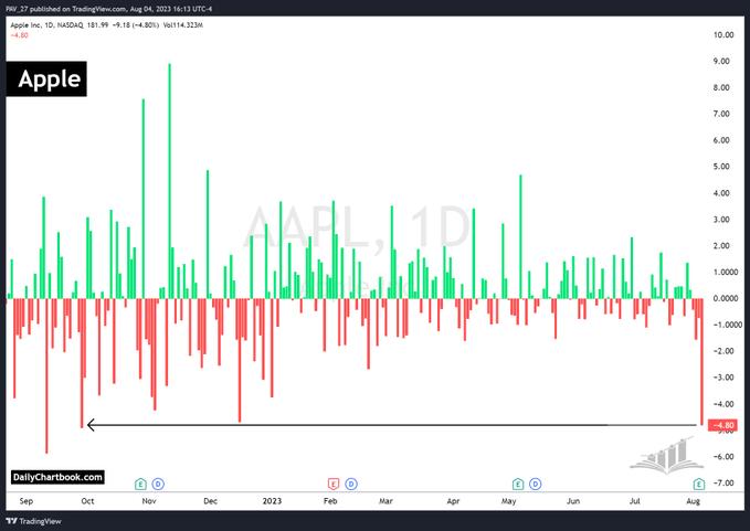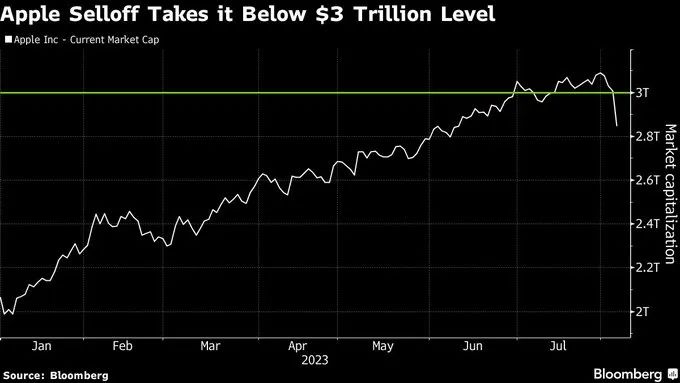 行情数据显示,苹果股价周五重挫了4.8%,市值大幅缩水至2.85万亿美元左右。这是该公司去年9月以来最大的单日跌幅,市值一天之内就蒸发了逾1600亿美元,折合人民币约1.15万亿元。苹果在不久前的6月,刚刚成为全球首家单日收盘市值达到3万亿美元的企业。2022年1月,苹果市值盘中曾短暂突破3万亿美元。