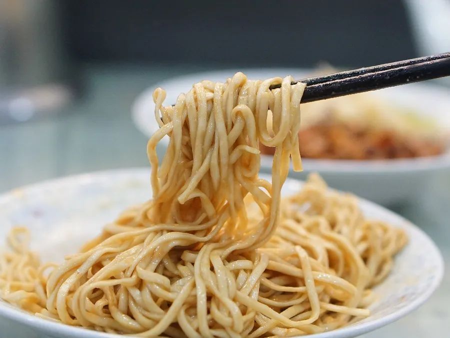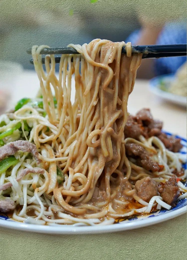 鸡蛋碱面煮后,和熟油吹凉,有的先蒸一道再煮,硬口些。淋花生酱、酱油、米醋、辣油或麻油、少许糖稀释而成的酱汁,这是一般家常做法,做生意的自是各有秘笈。