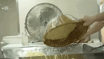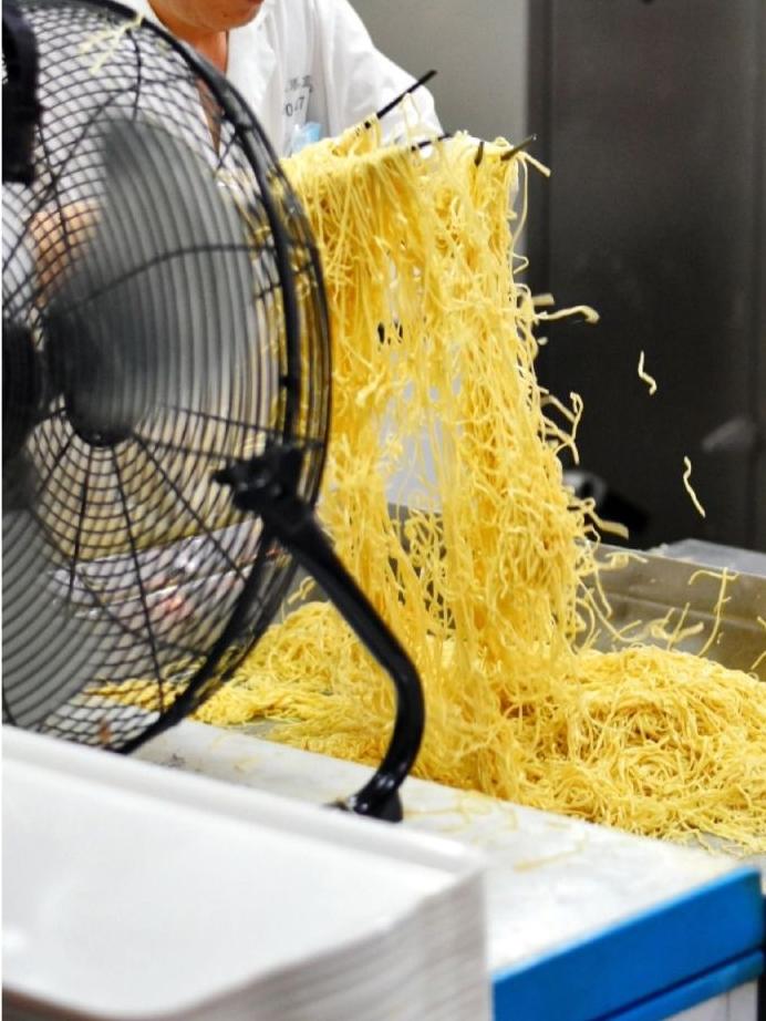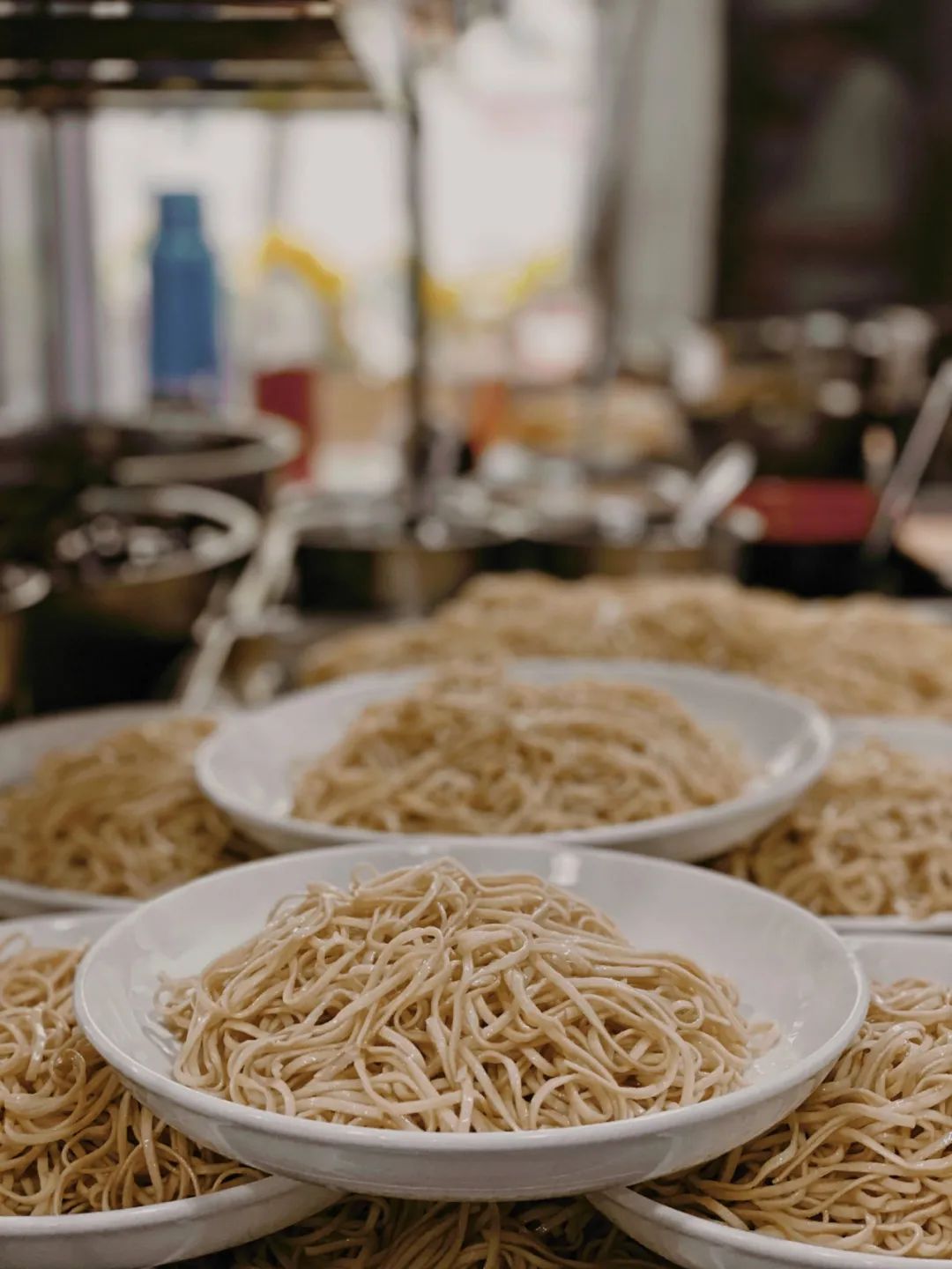 生面减一道蒸的工序,直接开煮,定制鼓风机吹凉,这样并非偷巧,相较与预先蒸过的,吃口软中带筋,碱面的弹性稍减,口感追求不同罢了。