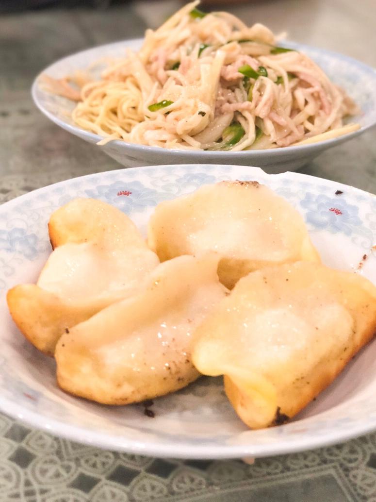 而主角冷面呢?淡黄色小阔面软硬等当,酱汁闻起来坚果香气不断,入口是很轻快的酸甜,浸入面里根根丝滑。第一次吃的时候惊喜于浓郁又柔和的花生酱香,后来再去,酱汁依旧爽口但坚果香淡了许多,不知是否调整了配方。锅贴倒是一向的高水准,半个掌心大的,脆皮兜满肉汁。