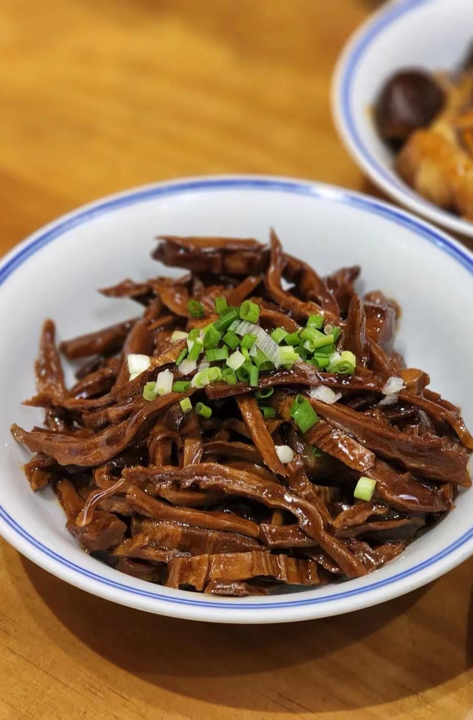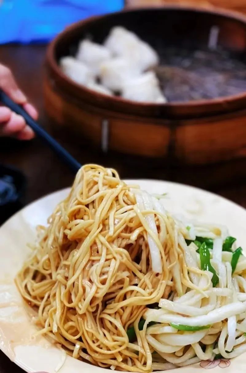 现炒的浇头,总体有些过了火侯,咸味稍重。辣酱是当家浇头,豆腐干、笋丁切得方正,吸足开洋的鲜香,拿来下粥也是极好的。呲溜一口面,就一口汤色清透的双档,正是老底子的饮食审美框架。冷面被写进上海人的面食基因里,丰裕、德兴馆、东泰祥、一心斋、小绍兴……数不完的老字号。