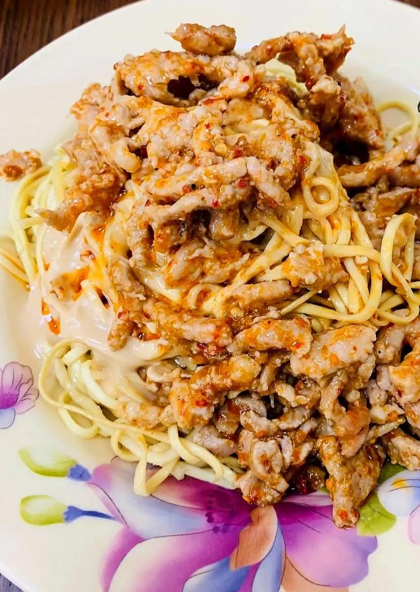 阿姨面冷但花生酱和浇头都给的大方。花生酱秘制的,脂香突出却不厚重,很容易拌开,融合其他酱汁,风味均衡,正宗老本帮风味,与甜口四如春相较,更清爽咸香些。面二两,口感硬质的,不烂糊,筋道清晰。