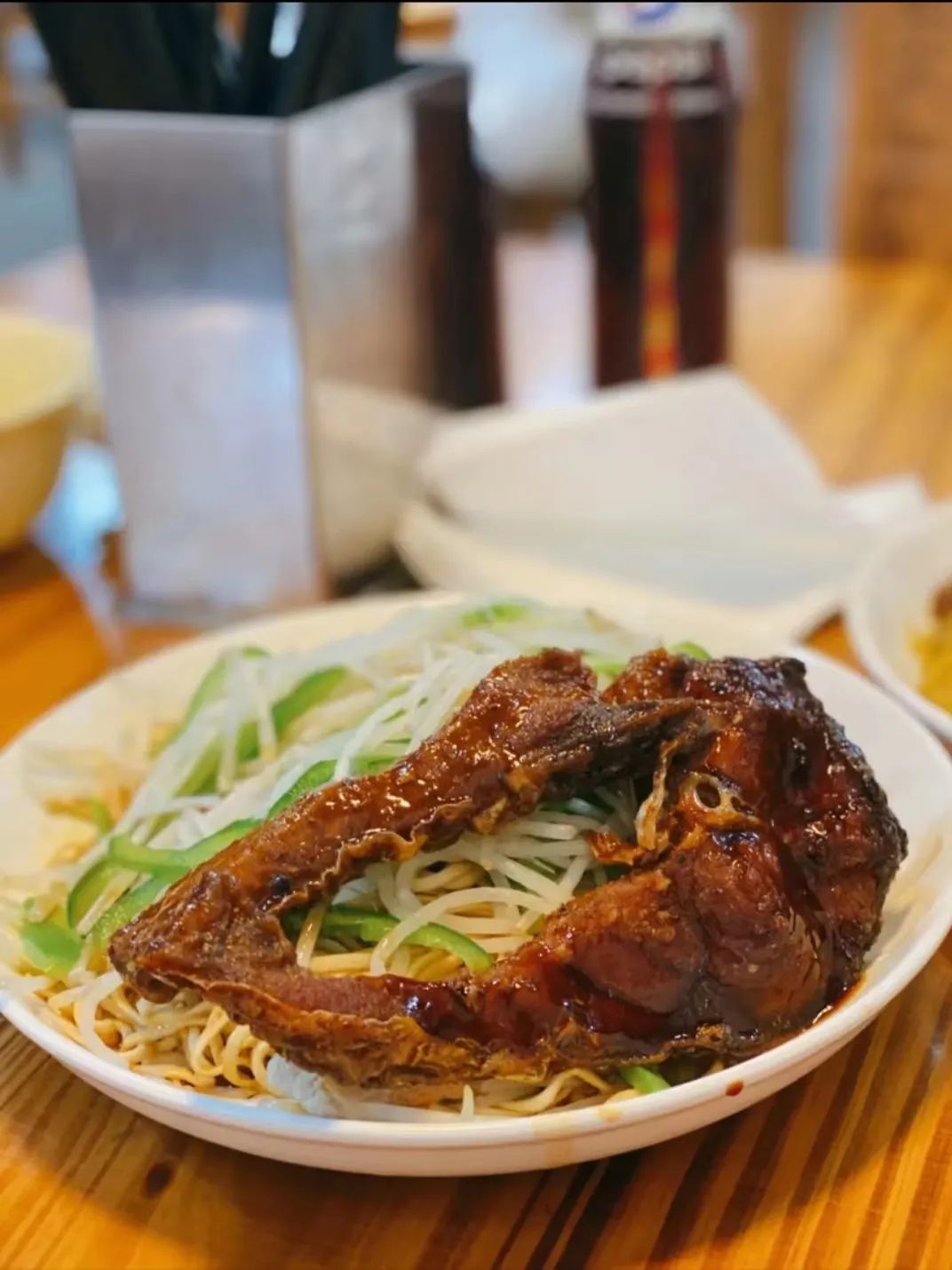 糖醋肉给足了份量,酱色糖醋汁裹着小肉,薄薄一层成了膜似的油亮油亮的,肉团得紧实下口仿佛在吃肉丸,富有诱惑性的微弹。露出粉面,面衣轻薄,肉感嫩到牙齿轻微抵抗后渐觉酥软。明明再家常不过的,搭冷面却有了独一无二的魅力。