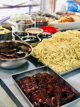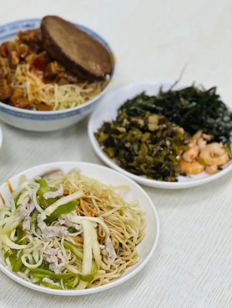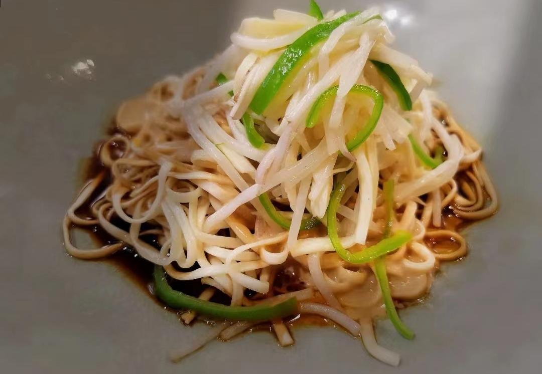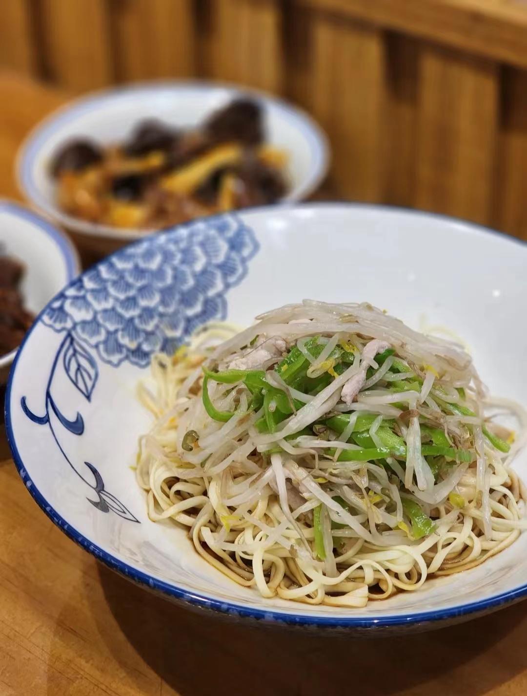 一天卖出上百斤冷面,两款经典冷面:青椒银牙丝和茭白炸菜肉丝,清鲜宜人,早早脱销。