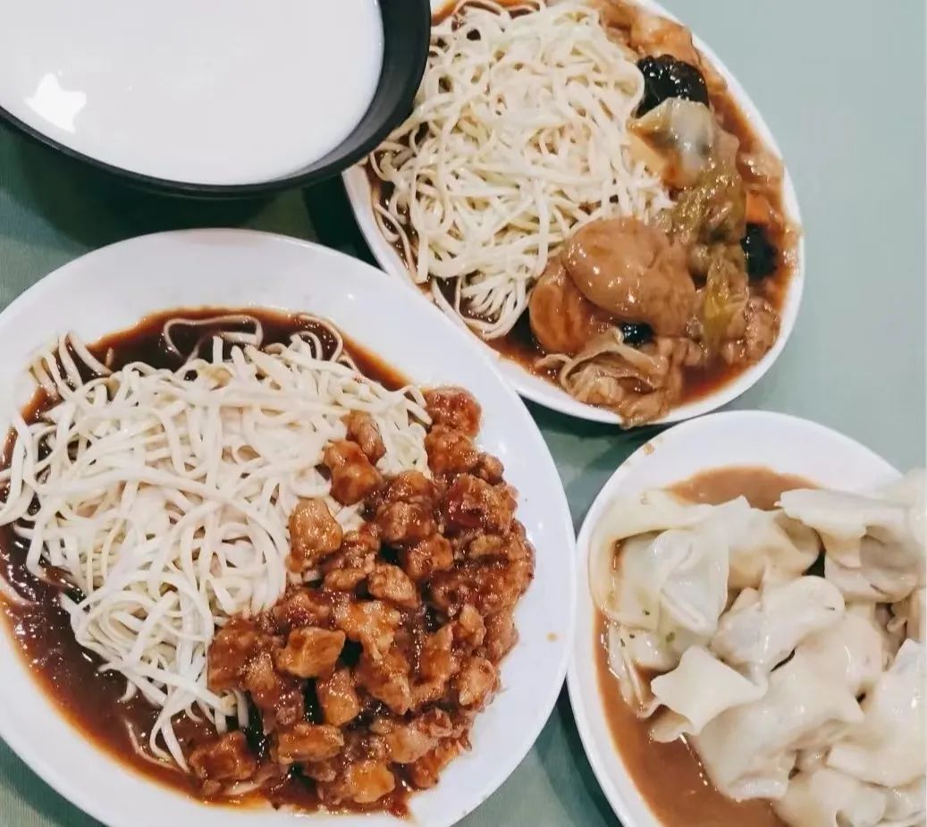 添一筷子断生响脆的绿豆芽,光面也足够有滋味。若佐一碟浇头,丰美至极了。浇头翻着花样地排开,从清口平价的素三丝到浓油赤酱的辣肉丁、红烧大排、鳝丝……浇头好吃的门店,小炒灵光,少不了打包小菜的、夜里咪老酒的。此类称得上社区共有的姆妈厨房,滋味不比老字号差。热得灶头冒火,家里姆妈烧不动了,就兜街上打几两面,回家分了吃。