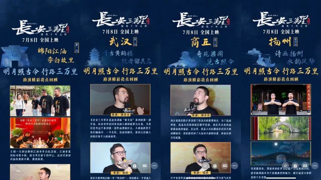 映后几日的路演,又侧重了河南、重庆。因为河南济源王屋山是世界上唯一保有李白真迹的圣地。重庆则是李白写下《早发白帝城》的地方,也是电影里李白吟诗最动人的一幕。同时,从预热到路演阶段,电影一直与这些文化城市的当地文旅密切联系,进行IP+文旅的合作联动。西安的首映礼与淘麦VIP音乐园游会联动,观众在一场美轮美奂的演出中梦回大唐。这些文化活动加上当地媒体的卖力宣传,不断唤醒中国观众骨子里的唐诗文化基因,让电影口碑通过文化层面不断地释放出来。