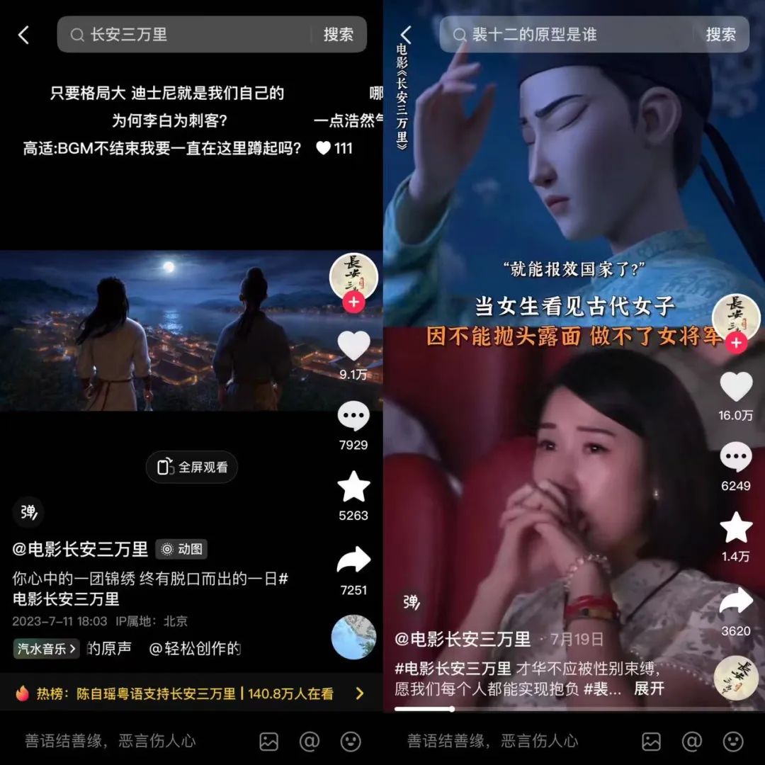 《长安三万里》的宣发,把一个看似与我无关的文化产品,变成了一个与普罗大众息息相关的精神产品,疗愈了很多普通观众。电影既使部分影迷接受诗词洗礼与文化熏陶,又能让广大观众找到情绪的宣泄窗口。