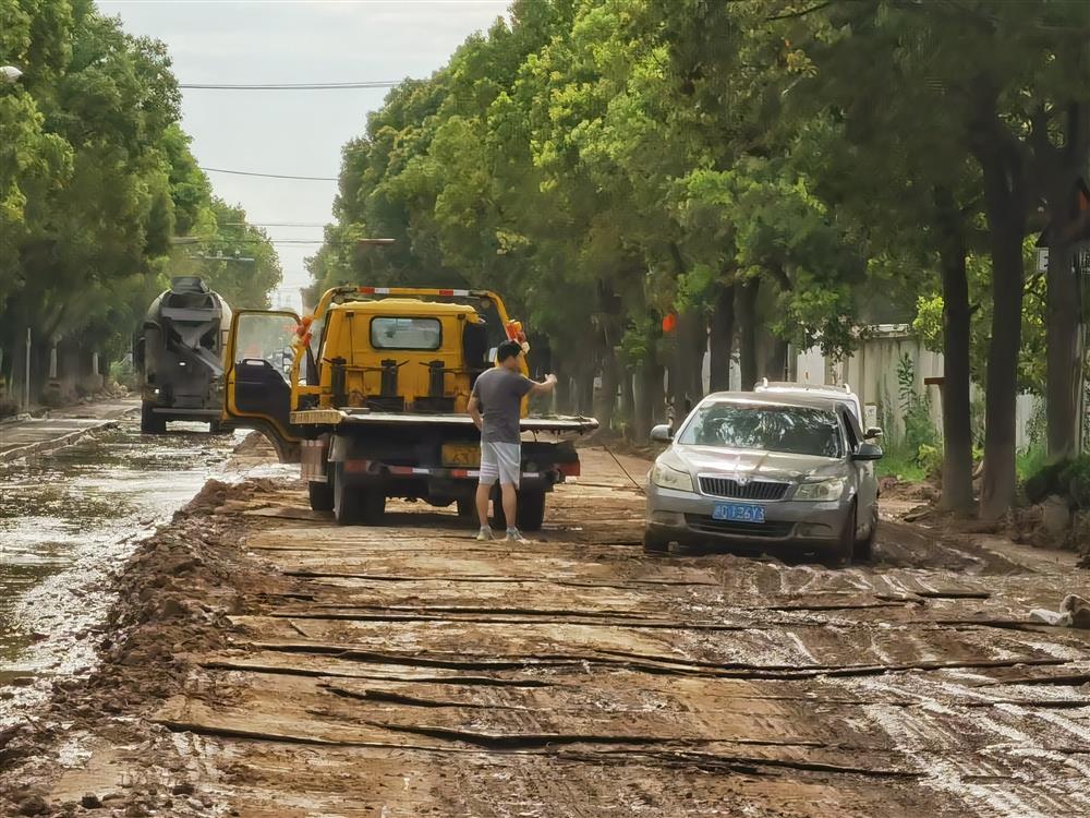玉阳路上,一辆车因深陷淤泥而抛锚,救援车正在想办法将其拉出来。