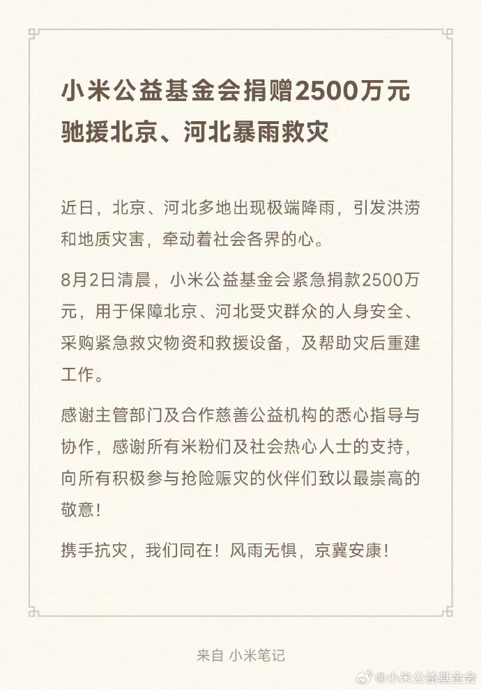 ·小米公益基金会捐赠2500万驰援北京、河北暴雨救灾