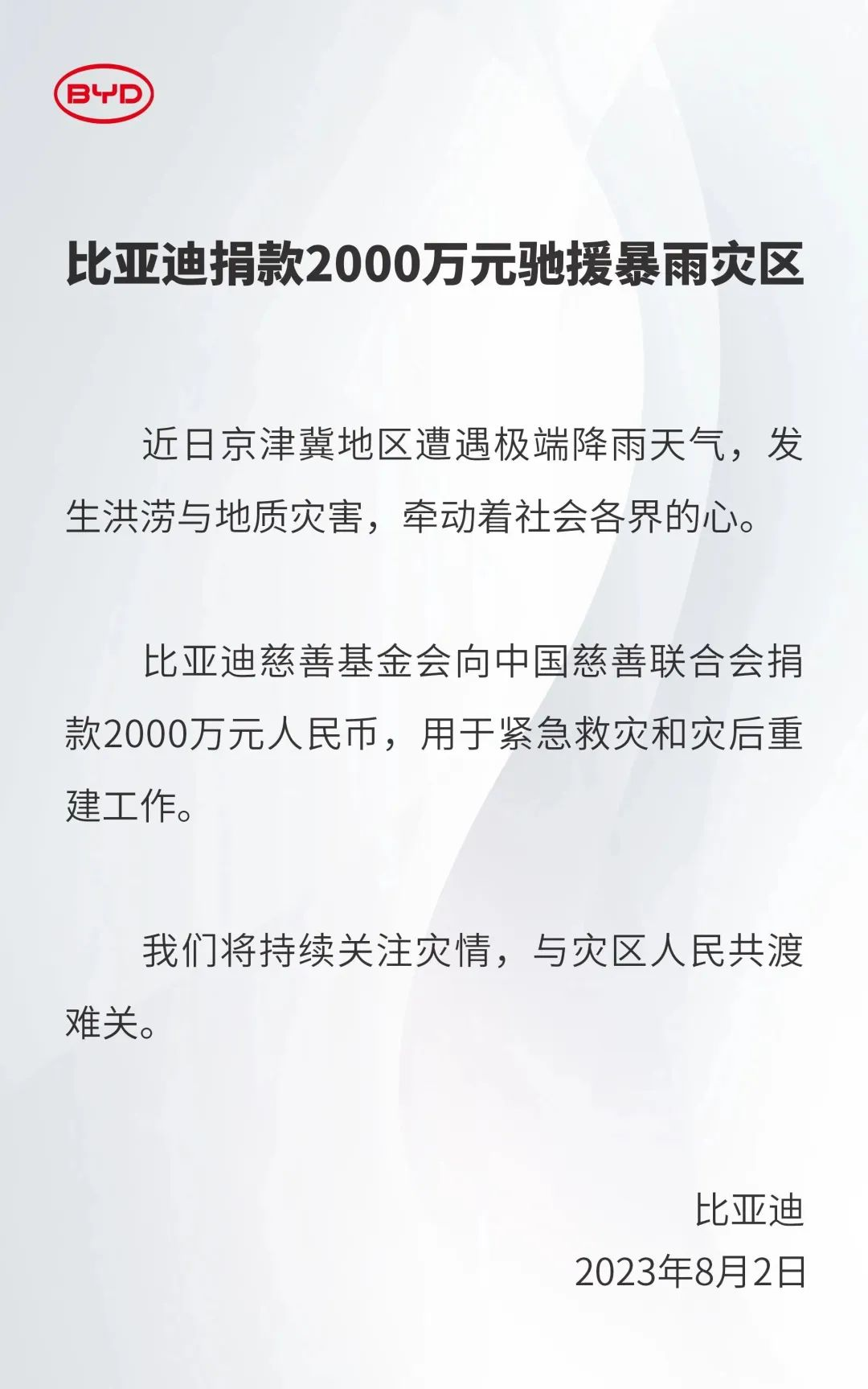 主题:比亚迪慈善基金会捐款2000万元驰援暴雨灾区
