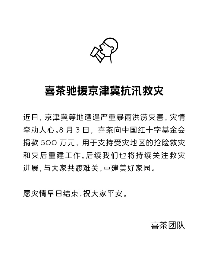 ·喜茶捐款 500 万元支持抢险救灾和灾后重建工作