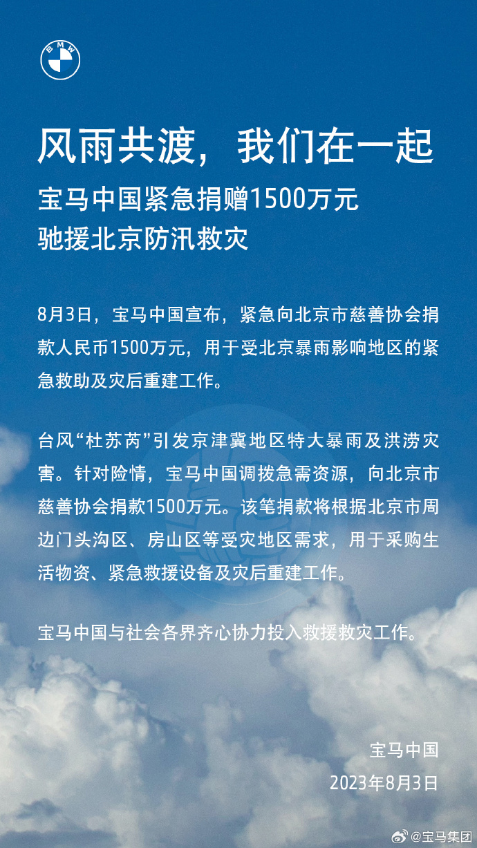 ·宝马中国紧急捐赠1500万元驰援北京防汛救灾