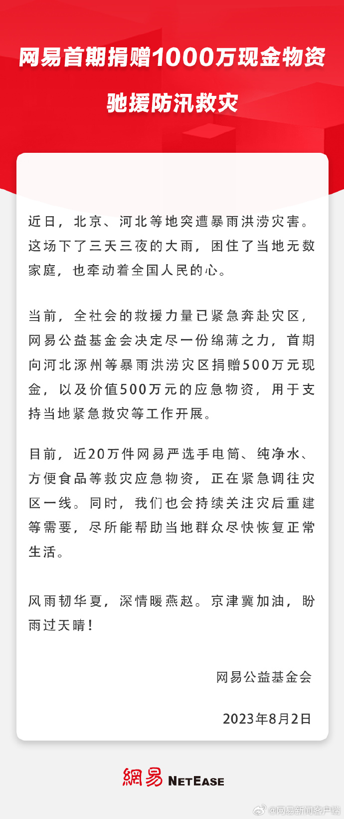 近日,北京、河北等地突遭暴雨洪涝灾害,网易公益基金会决定首期向河北涿州等暴雨洪涝灾区捐赠500万元现金,以及价值500万元的应急物资,用于支持当地紧急救灾等工作开展。
