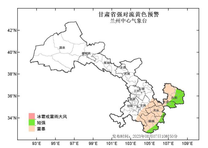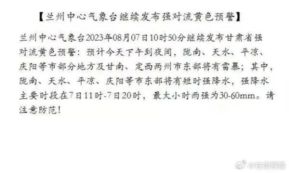 兰州中心气象台2023年08月07日10时50分继续发布甘肃省强对流黄色预警:预计今天下午到夜间,陇南、天水、平凉、庆阳等市部分地方及甘南、定西两州市东部将有雷暴;其中,陇南、天水、平凉、庆阳等市东部将有短时强降水,强降水主要时段在7日11时-7日20时,最大小时雨强为30-60mm。请注意防范!