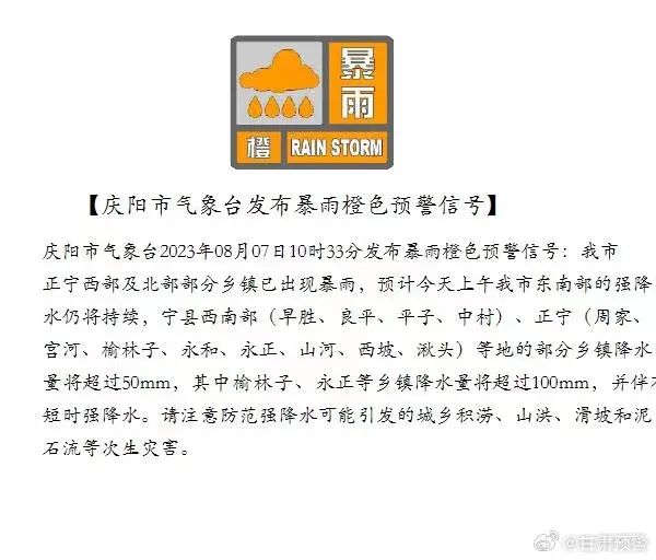 庆阳市气象台发布暴雨橙色预警信号: