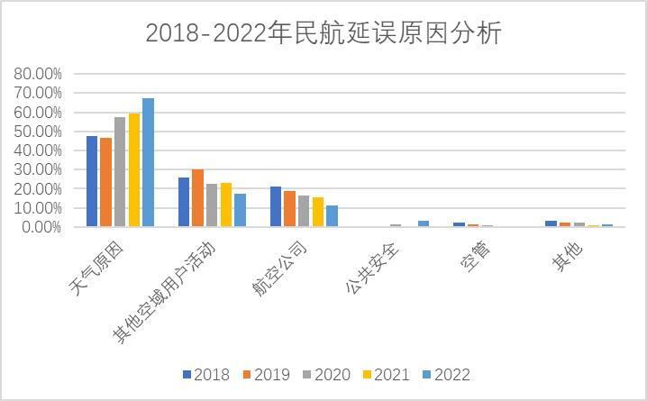 根据民航局关于2018-2022年度航班正常情况的通报,分析出影响航班正常性的主要原因有:天气原因、其他空域用户活动、航空公司原因、公共安全原因、管制原因、其他原因,如图所示。