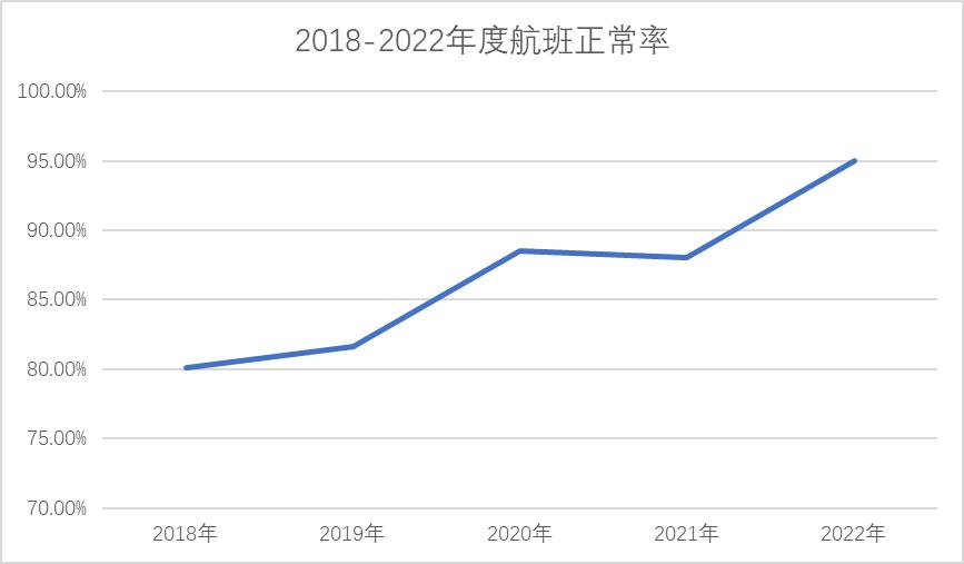 图2从图2可以看2018年至2022年总体航班正常性一直持续正增长,这与2020年-2022年疫情冲击,航班量骤减,航班时刻资源充裕有很大关系。刨除疫情影响因素,由图1我们可以明显看出,天气原因始终是影响航班正常性的主要因素,在复杂天气条件下持续提升航班运行品质考验的正是运行控制部门风险识别和管控能力。