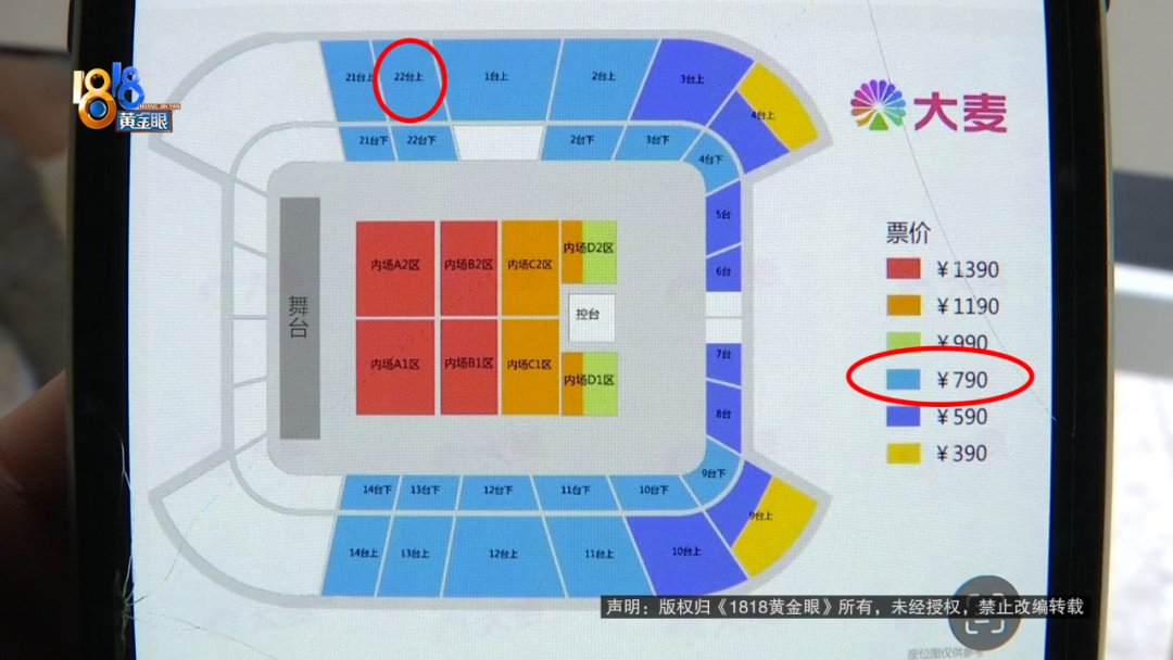 尤先生介绍他是歌手蔡依林20年的老歌迷了,朋友通过大麦网购买了4张790元价位的门票,位置在看台的22台上32排,这属于看台上价格最贵的区域。