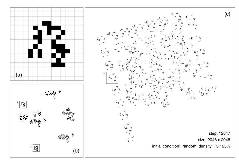 基于元胞自动机,1970年康威提出生命游戏,成为了研究人工生命的典型工具。生命游戏在二维网格上展开,演化基于九宫格中的局部信息。只需遵循简单规则,却可在宏观产生或周期变化、或随机出现的图案。更有趣的是,有些图案会呈现自相似等复杂特征。由于生命游戏的规则简单,普通人无需复杂编程,即可给定规则与初始状态,之后扮演这个二维格子宇宙中的上帝,观察系统能否演化出有趣的模式。