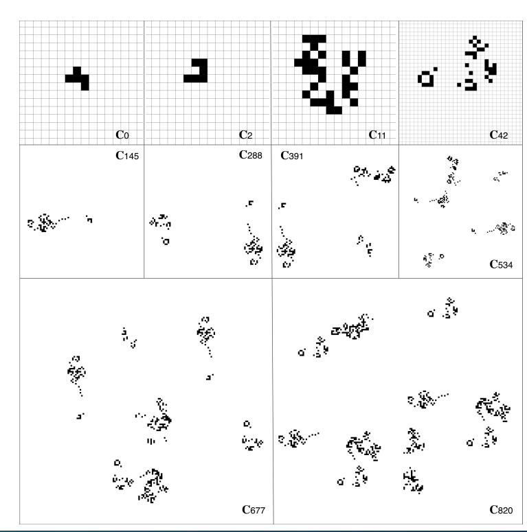 图5展示了演化过程的动力学,其中C2的模式可以看成是种子,之后每隔143步,就会再次出现,例如第145、288、391等步中,都出现了一个或多个这样的模式。这在动力学中被称为吸引子。该图中的种子模式不具备左右对称性,但可以通过旋转重现,即具备旋转对称性。