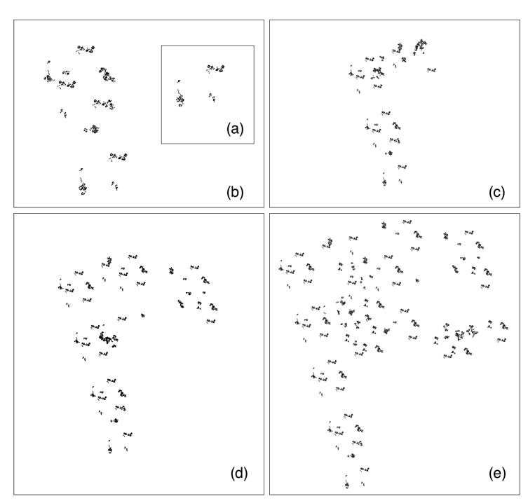 在更宏观尺度上,演化过程中会出现聚集现象,即处于活状态的点聚在一起,并按照固定间隔,呈现相似的模式,如图6所示,每隔1556步会呈现相似的模式。从视觉上看,近似一个手臂(图6c中的模式)在每一次之后的演化中出现,同时慢慢地脱离原来的位置产生一个新复制。这一复制尽管不能看出是作为一个整体自复制,但演化过程中涌现出近似的自复制因子。这一现象是巧合还是具有必然性,需要进一步研究。