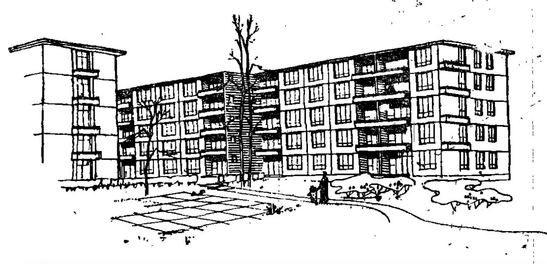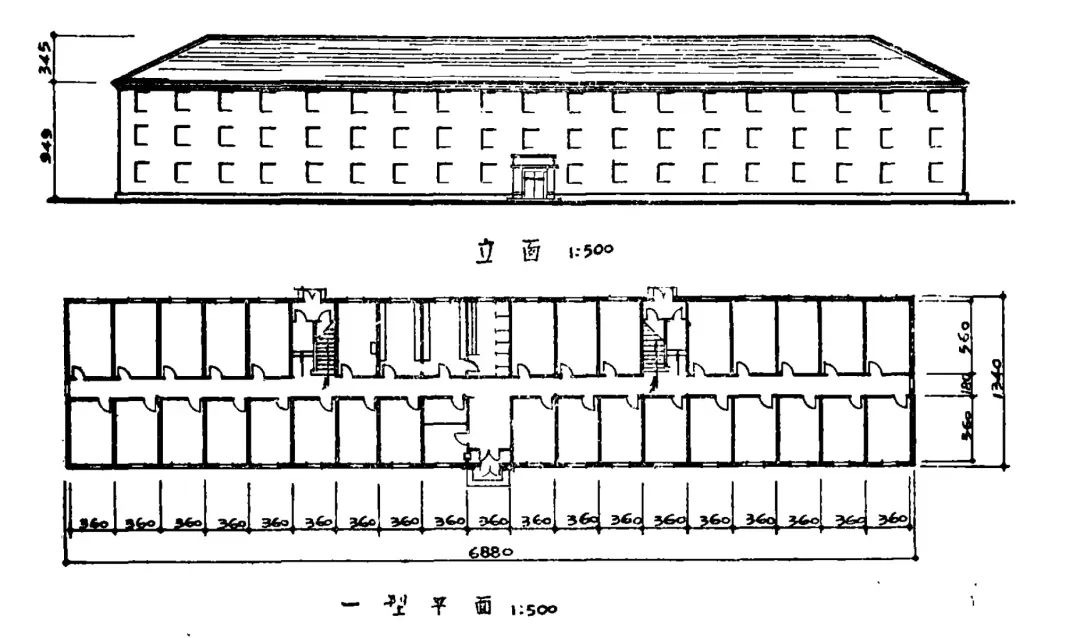 东北工业建筑设计院 1955 年为东北一区单身宿舍所做的定型设计,此类建筑的平面成为未来人们刻骨铭心的“筒子楼”记忆的重要来源 [1]单元楼适当考虑了隐私问题,也许是稍嫌高标,它的布局问题显得没那么重要了。如同兵营一样单调的“行列式”楼群,大多排得整整齐齐,就算是家家南北通透,大家也是早晚“面面相觑”。如果说建筑安排略给人一点点差异感,就是居民们大多只能从楼的南面出入,其余三面,有两面通常写着楼的名称和号数,用的美术字体——这,是整幢住宅楼唯一有点形象设计的地方。剩下一面,事实上是楼的背面,尤其低层,各家的卫生间和卧室,因为和路人的视线过于接近,窗口通常挂着厚厚的窗帘。