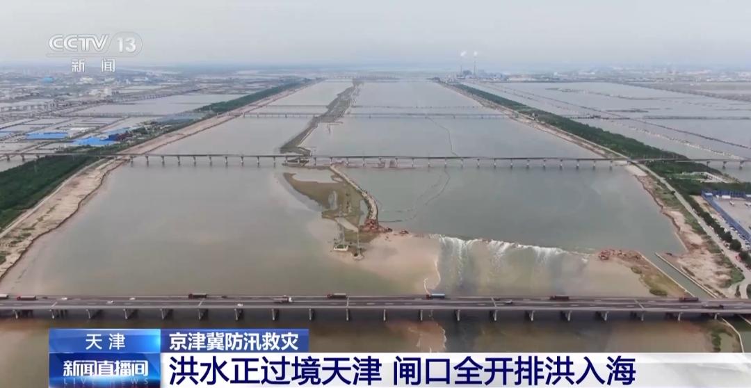 总台央视记者 张智:我现在在天津市独流减河防潮闸的工作桥上,我脚下的22口防潮闸闸门已经全部开启,来自大清河及上游水系的洪水正在从这里汇入渤海。