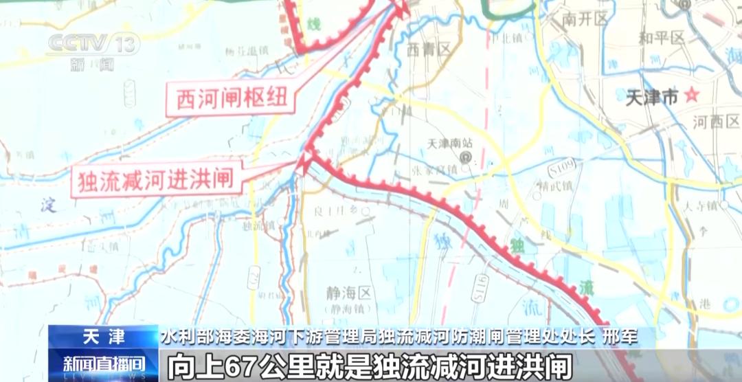 水利部海委海河下游管理局独流减河防潮闸管理处处长 邢军:独流减河防潮闸向上67公里就是独流减河进洪闸,再向上就是大清河。在本次洪水过程当中,海河流域启用了8个蓄滞洪区,其中有3个就在大清河系。8月6日22时,大清河洪水水头已经进入了独流减河,独流减河防潮闸是大清河洪水唯一的入海通道,所以防潮闸防洪压力非常巨大。、