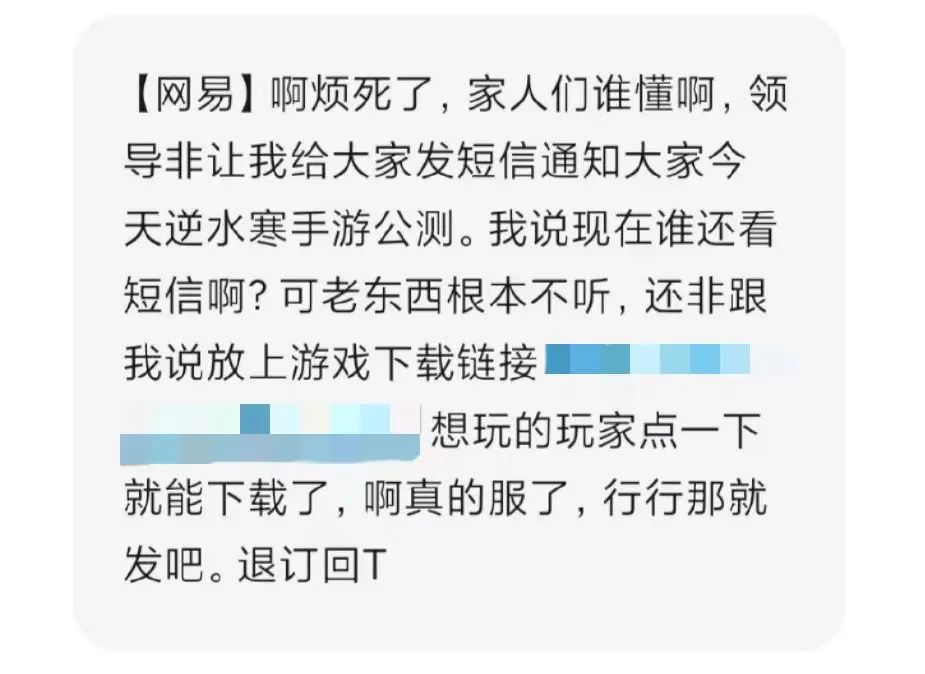 MMO老玩家刀行告诉我,他下载《逆水寒》手游的契机是一条开服短信,一条以“啊烦死了,家人们谁懂啊”为开头的短信。