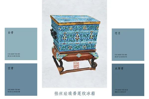 “太师青”凉风至之合色。陆游《老学庵笔记》云“蔡太师左相时,衣青道衣,谓之‘太师青’”。故宫博物院藏宋徽宗赵佶《听琴图》中听琴者其一或为蔡京,其青袍之色则为太师青。