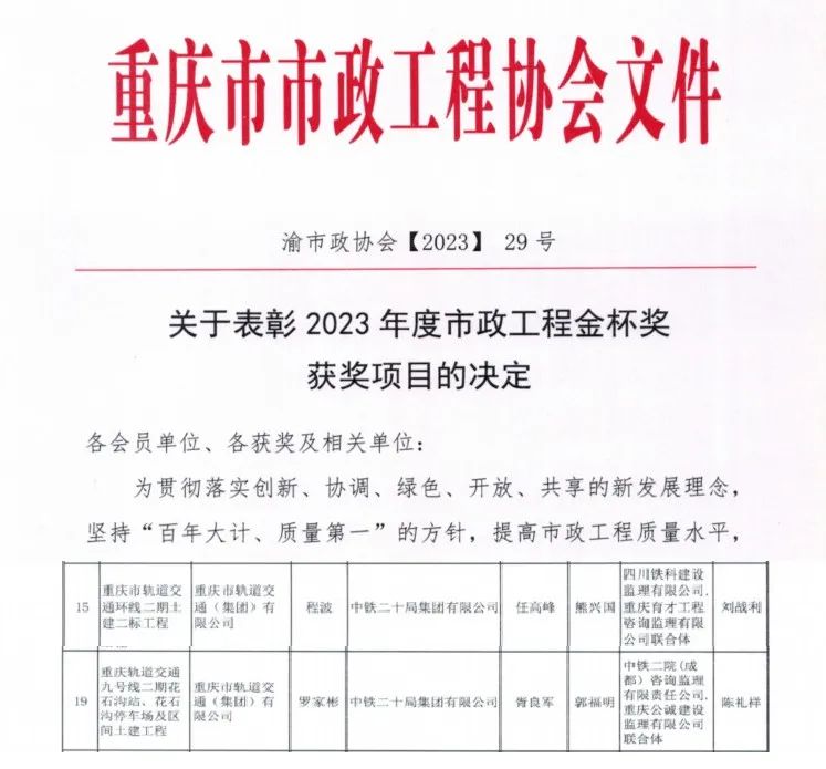 丨两项工程喜获“重庆市政工程金杯奖”丨中铁二十局三公司承建的两项工程