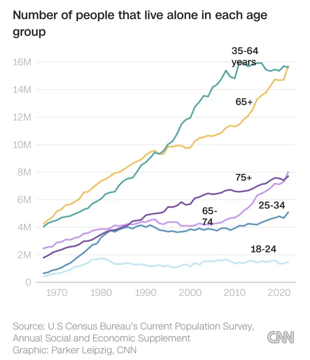 2022年,美国有近 1600 万 65 岁及以上的人选择独居,这比1960 年代时多了三倍。