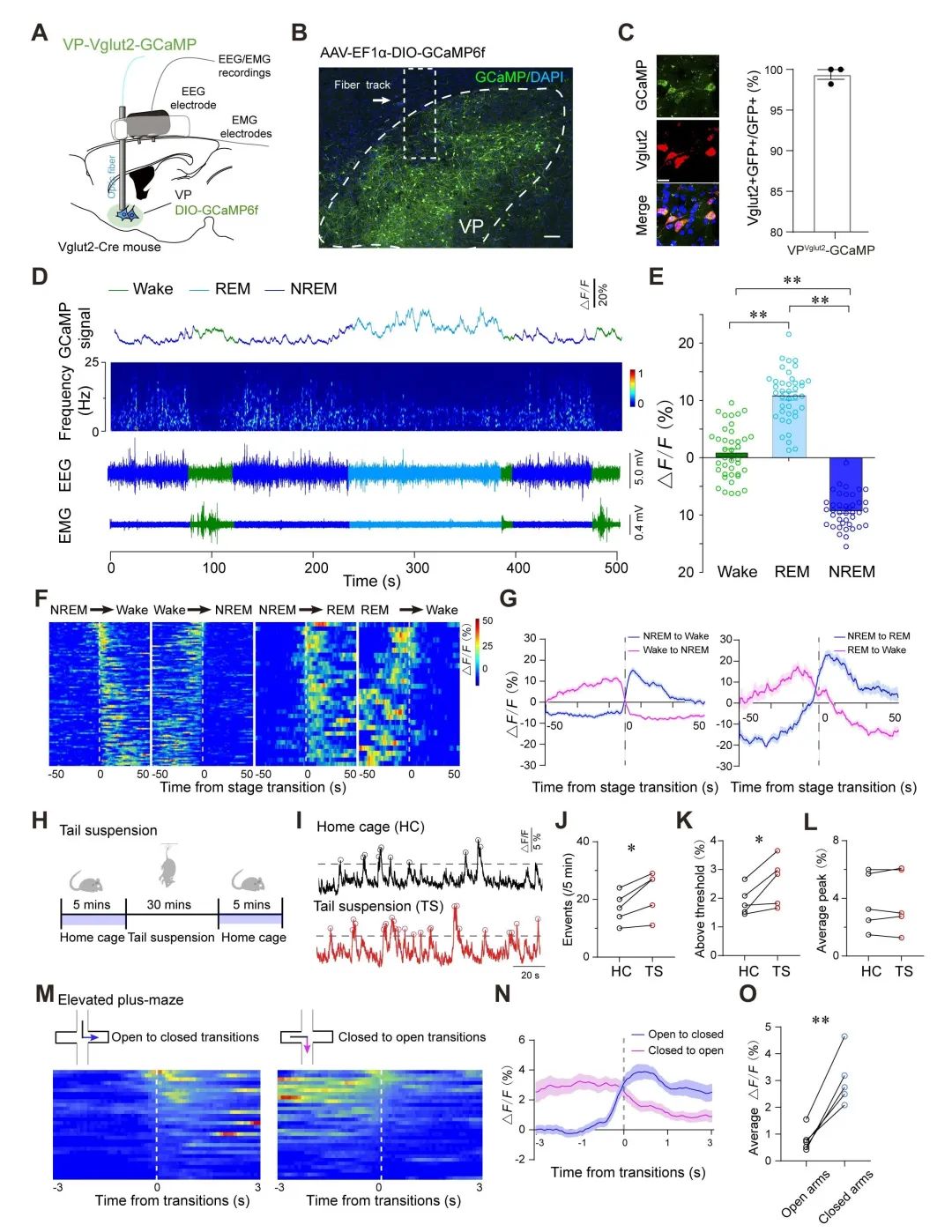 图1. VPVglut2神经元在睡眠-觉醒和情绪变化中的动态活动