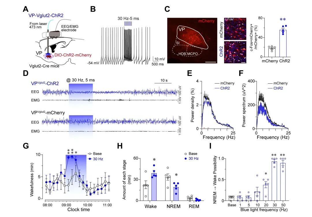 而后研究人员利用光遗传学、化学遗传学特异性激活或抑制VPVglut2神经元,以探究VPVglut2神经元与觉醒之间的因果关系。结果显示,激活VPVglut2神经元促进了觉醒,抑制VPVglut2神经元导致觉醒时间减少,提示异常激活可能导致失眠(图2 & 3)。