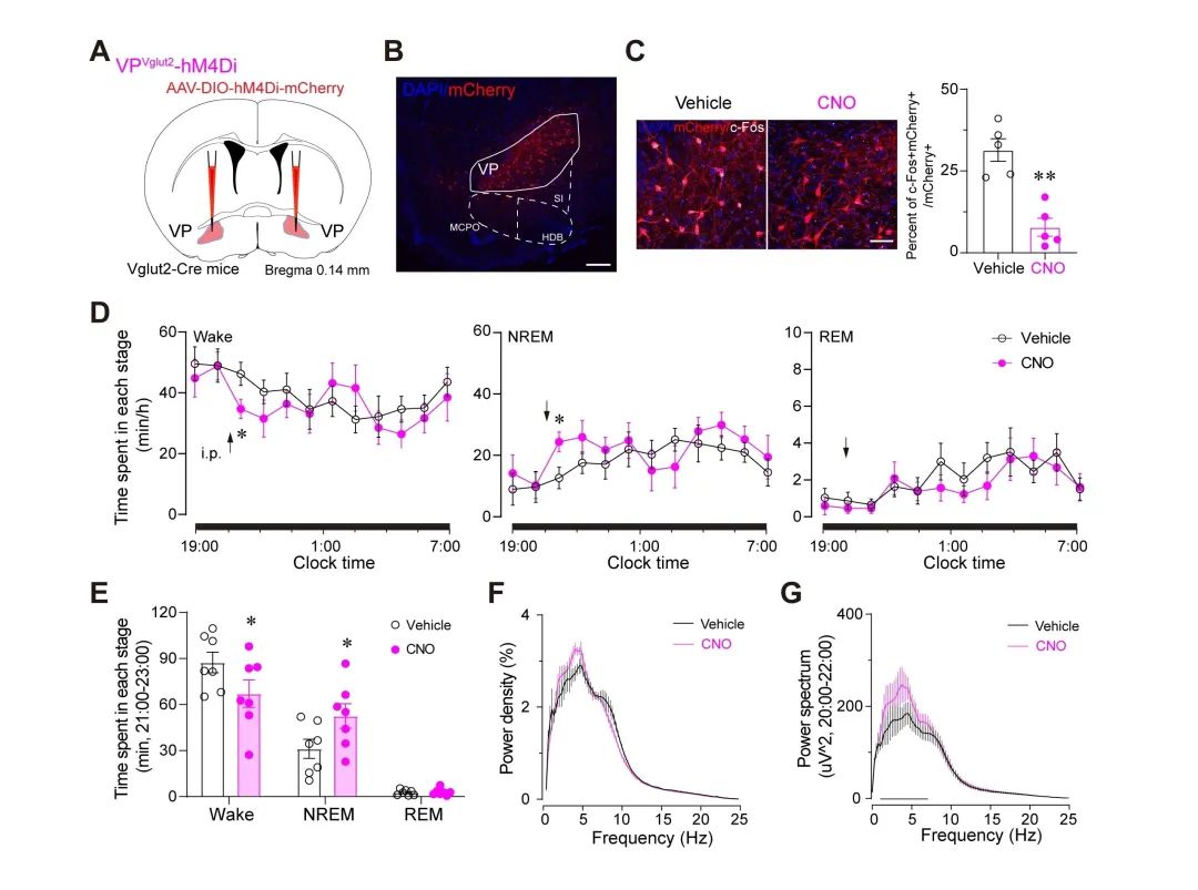 腹侧基底神经节中重要的中继核团VP在睡眠觉醒和情感调控中发挥重要作用。黄志力课题组李亚东、罗艳佳等先前报道了腹侧苍白球中占60%以上的GABA能神经元控制与动机相关的觉醒(Mol Psychiatry, 2021)。然而, VP中还有约30%的谷氨酸能(VPVglut2)神经元,其如何调节觉醒和相关情绪异常在很大程度上是未知的。因此,研究人员就VPVglut2神经元如何通过不同环路调控抑郁和相关觉醒行为展开研究。