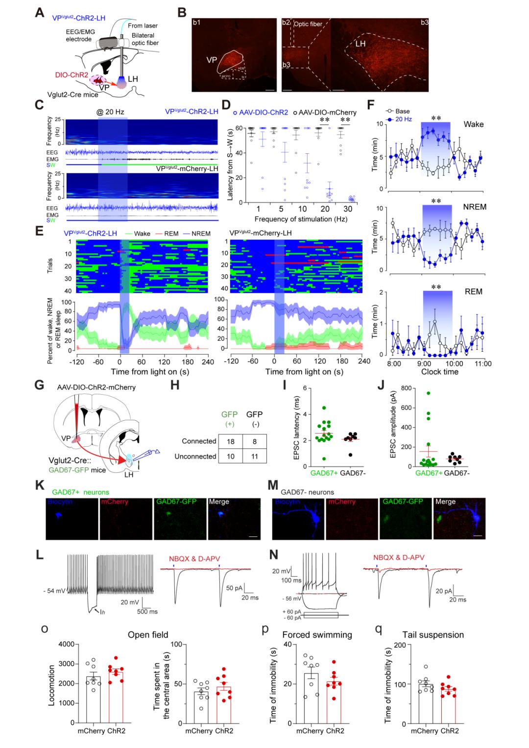 研究人员进一步解析了VPVglut2神经元调控觉醒和抑郁样行为的神经环路。VP密集投射外侧下丘脑(LH)和外侧缰核(LHb)两个脑区,两者被报道分别参与觉醒和抑郁样行为的调控。利用光遗传学在体内激活VPVglut2-LH的环路促进觉醒,但没有明显改变抑郁样行为。光遗传结合电生理实验表明,VPVglut2神经元非选择性支配LH中GABA能神经元。以上结果提示LH可能是VPVglut2神经元调控觉醒的重要下游脑区(图5)。
