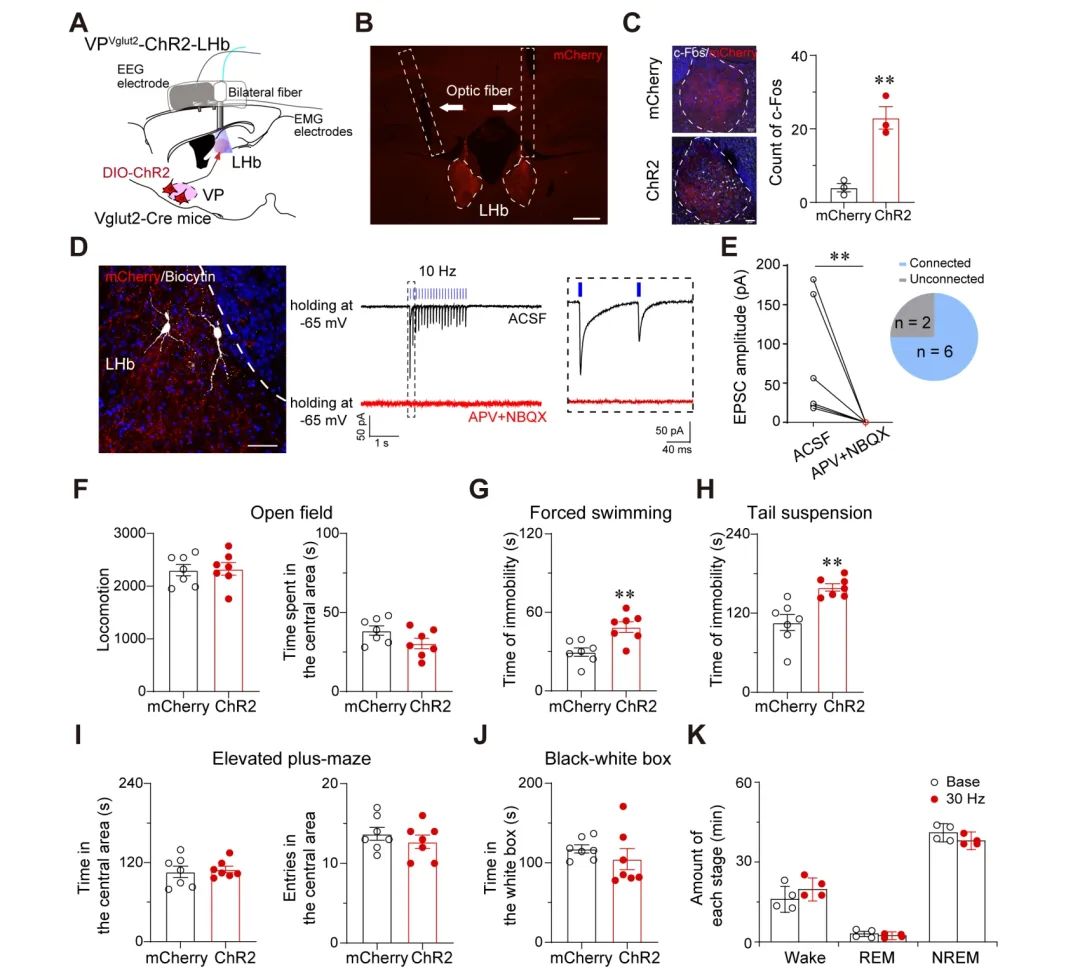 光遗传结合电生理记录显示,VPVglut2神经元通过释放谷氨酸兴奋LHb神经元。在体光遗传激活VPVglut2-LHb环路显著增加了悬尾和强迫游泳实验中的静止时间,提示产生抑郁样行为。光遗传激活VPVglut2-LHb环路并不明显影响睡眠和觉醒的时间,提示VPVglut2到外侧缰核的投射只参与情绪的调节。